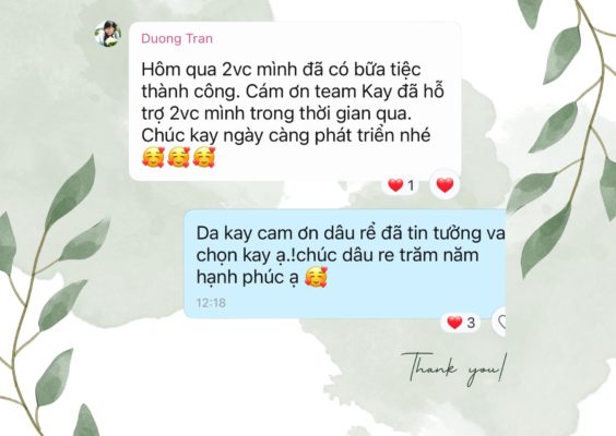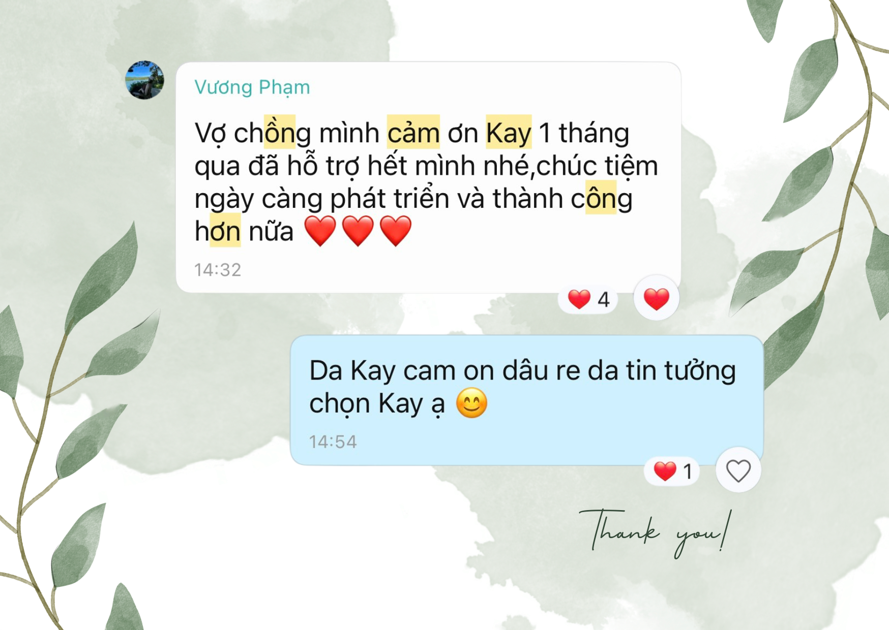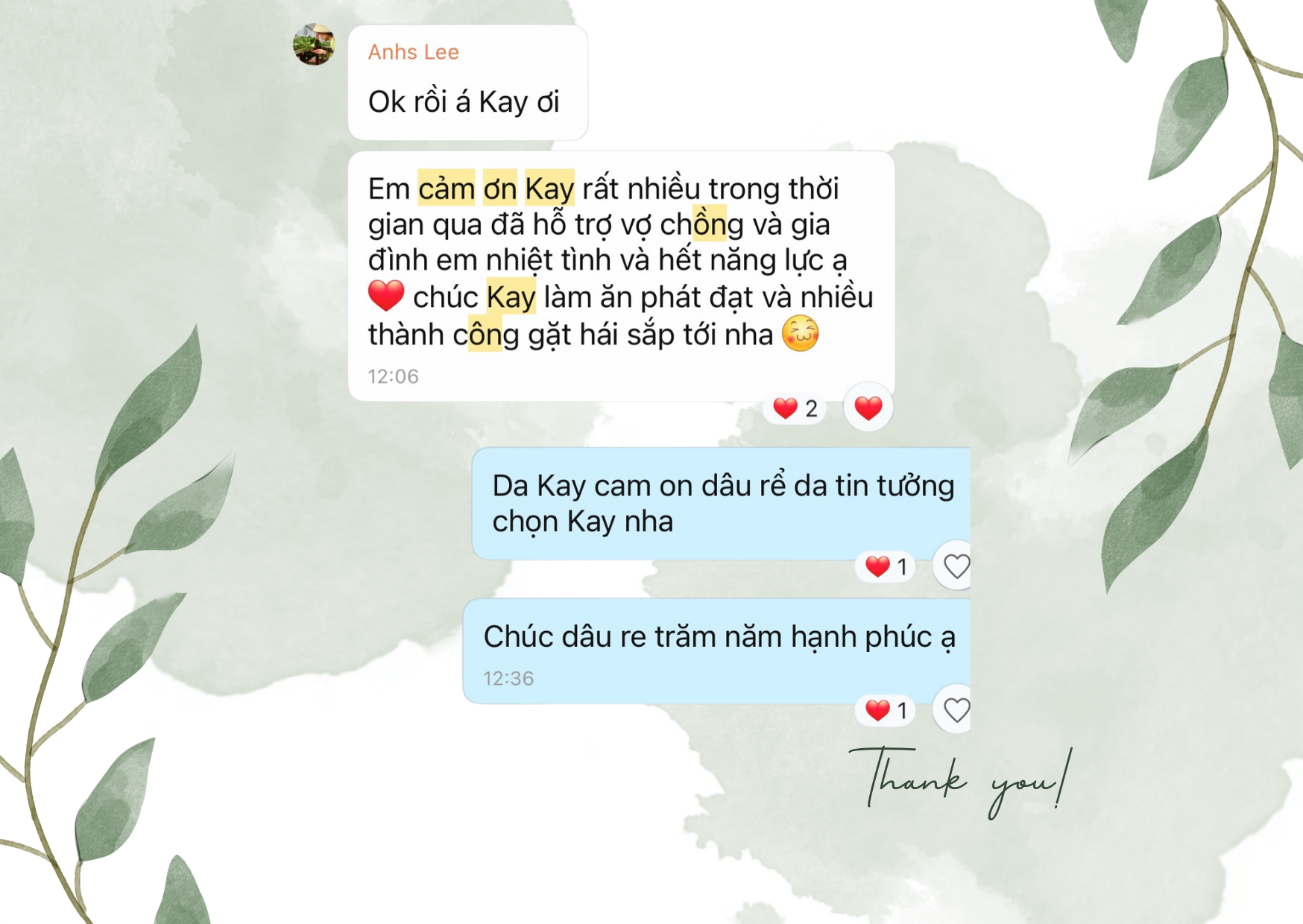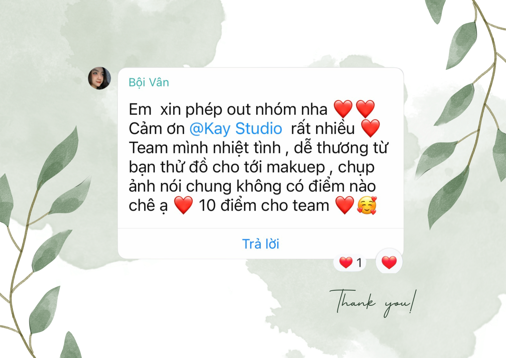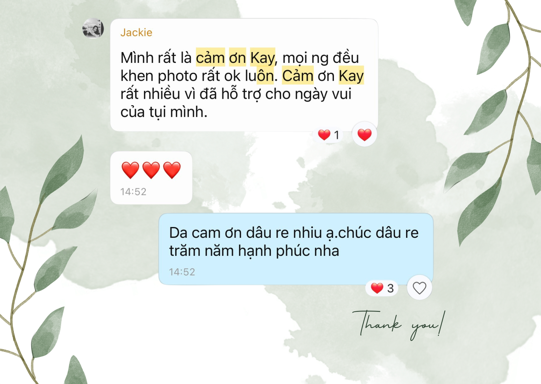 Với gần 10 năm hoạt động, KAY luôn nhận được sự yêu mến từ đông đảo khách hàng. Điều đặc biệt là gần 70% khách hàng biết đến KAY thông qua sự giới thiệu từ bạn bè và người thân. Chúng tôi tự hào khi 100% hình ảnh đăng tải trên các trang mạng xã hội đều là những khoảnh khắc hạnh phúc của khách hàng thật, không phải người mẫu chuyên nghiệp. Đó chính là minh chứng rõ ràng nhất cho sự tin tưởng và hài lòng mà khách hàng dành cho KAY. Với chúng tôi, mỗi bức ảnh không chỉ là tác phẩm nghệ thuật mà còn là kỷ niệm đáng trân trọng trong hành trình tình yêu của bạn.